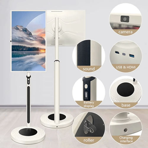 - 32 Inch 4K Smart Portable TV, Qualcomm Snapdragon 665 CPU, Built-in 20000mAh Battery with 10H Life Time, 8+128GB, Android OS, Rolling Touch Screen Monitor on Wheels, Air Remote Mouse, with 5MP Webcam